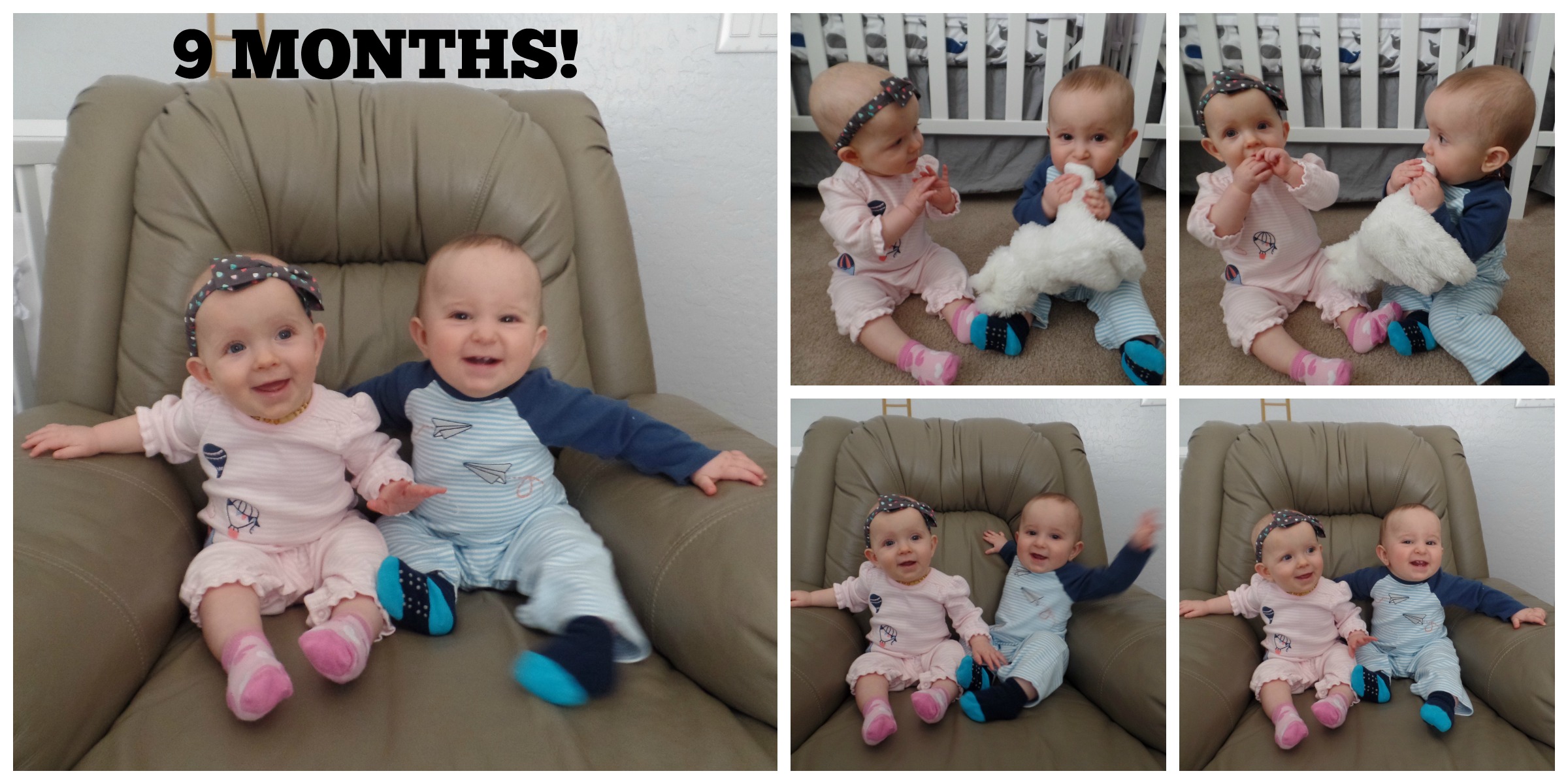 We are 9 months old and both of us are crawling all over the place!  Aurelia is 14 lbs, Avery is 16.5.  Aurelia has her two bottom teeth and is cutting all 4 top teeth at once!  Avery has his two bottom and two top, and is getting a third top tooth!