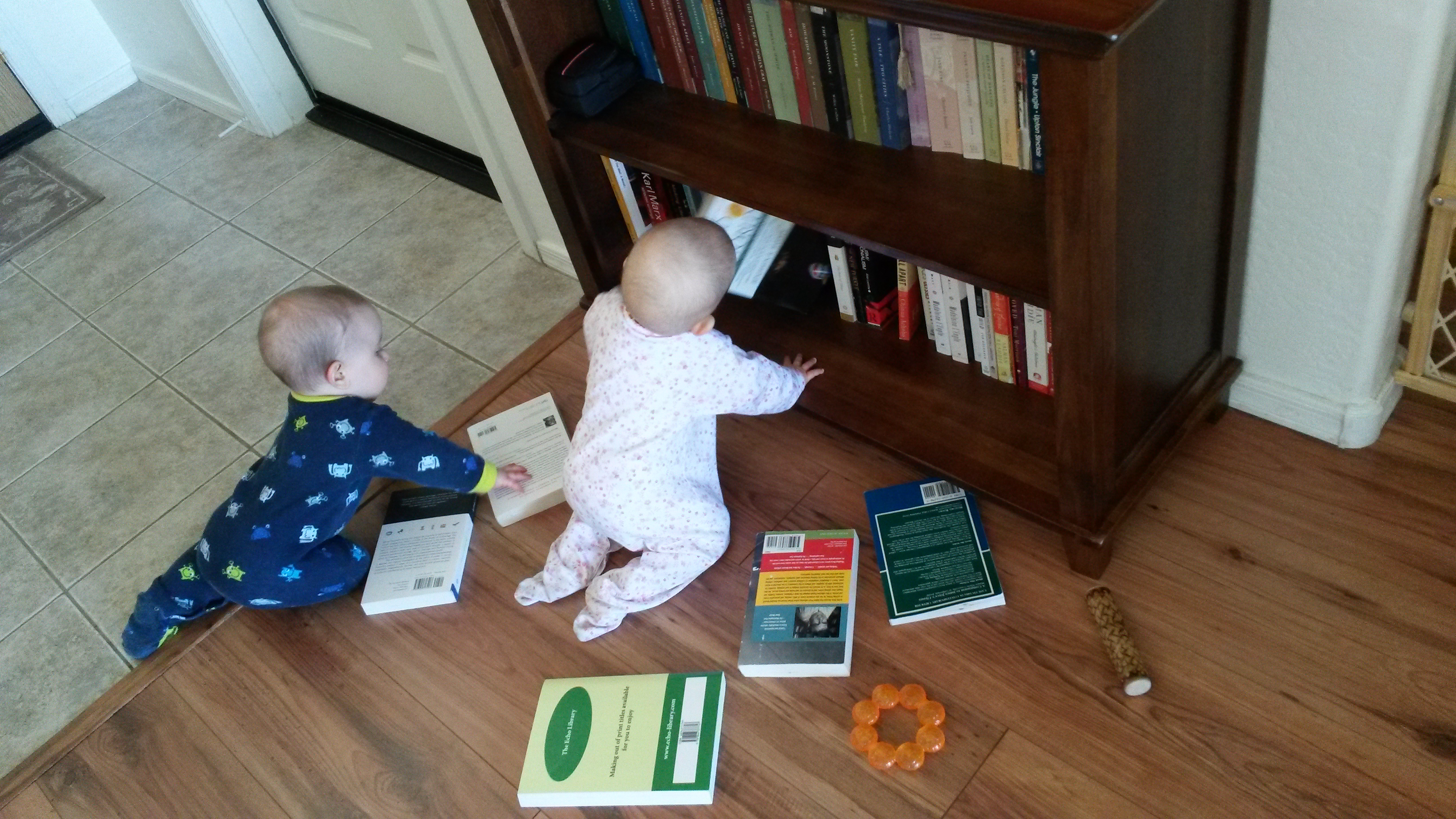 We love reading. Aurelia especially loves books! Their favorite books now are Peek-a Who? and Mr. Brown Can Moo, Can You? They occasionally raid mommy and daddy’s bookcase. They always pull out the guide to Ulysses. It must be their Irish roots!