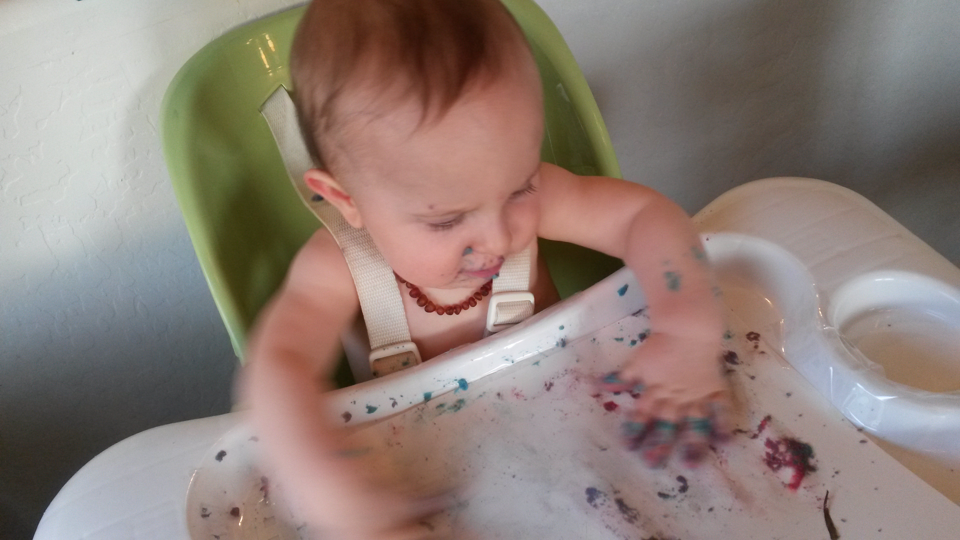 For Mother’s Day we made Omi a card. Â It was our first time painting! Â It was homemade paint so it was edible, which is good, because you can see what happens when you tell Aurelia “Not in your mouth”.