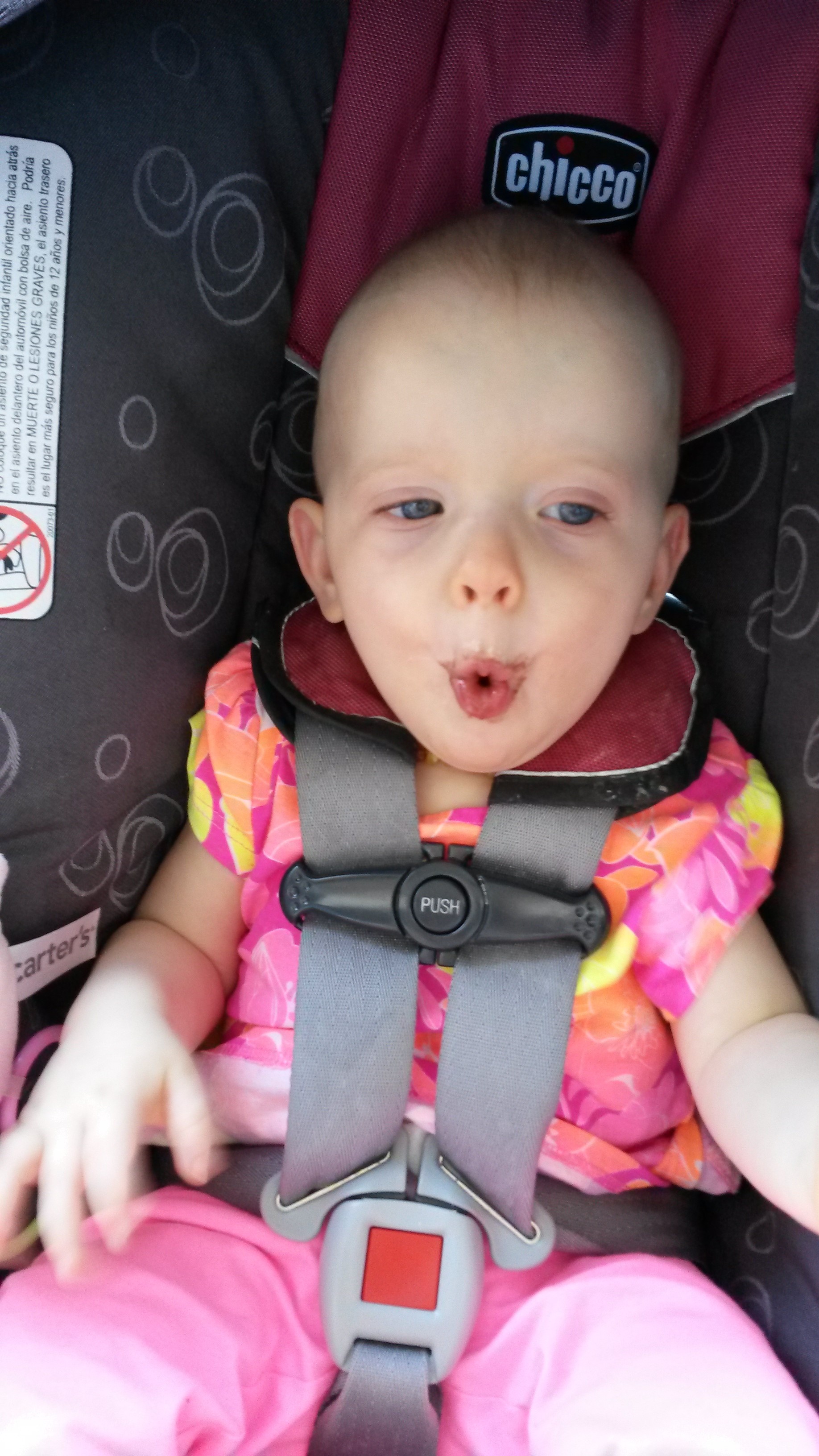 We each have eight teeth! Our favorite foods are fruits. We don’t like veggies too much but we do like green beans. Bananas and raspberry and kiwi are some of our favorites. And we love watermelon! Sweet potato fries are another hit. Aurelia really likes peanut butter. If you give her a waffle with peanut butter she will suck off the peanut butter. When we don’t like a particular food we will let you know by promptly throwing it on the floor. But then sometimes we will eat it off of the floor when you put us down, so you never can tell.