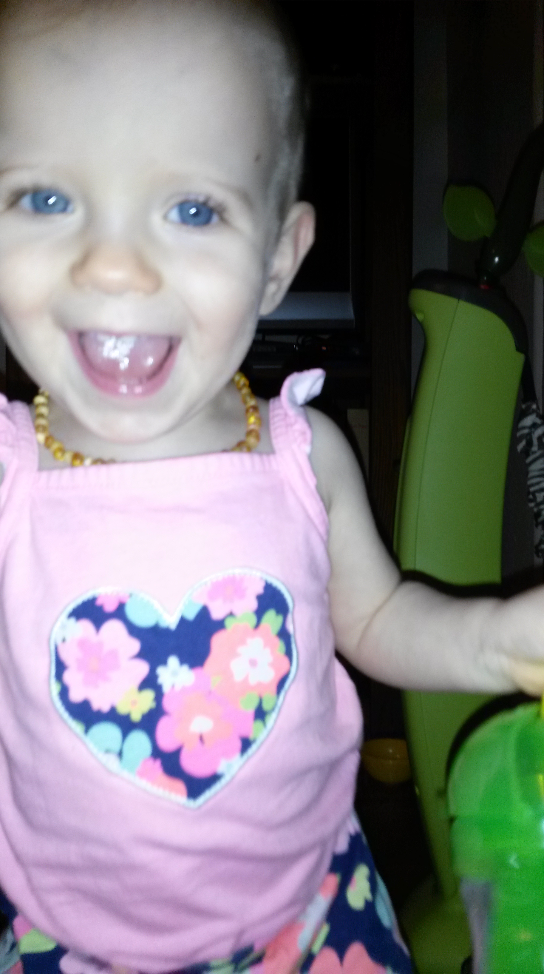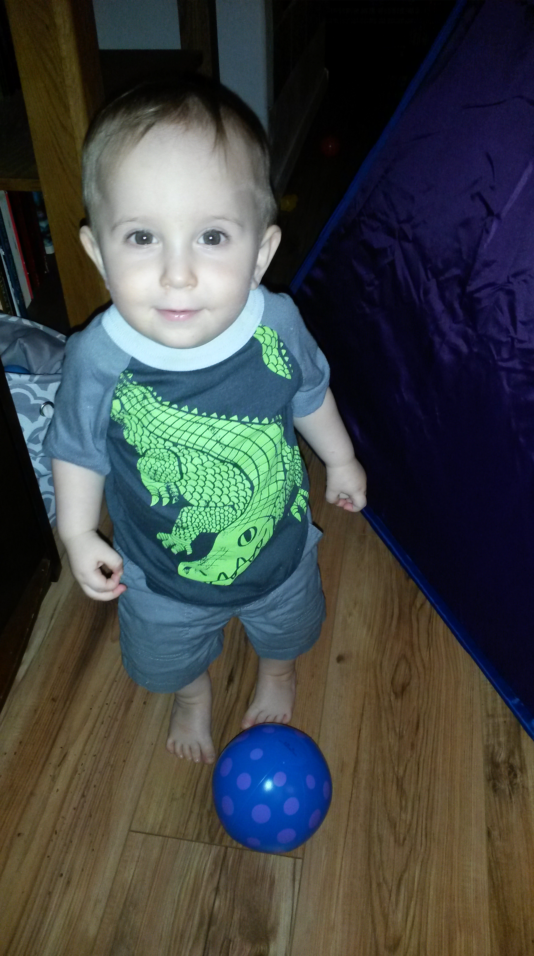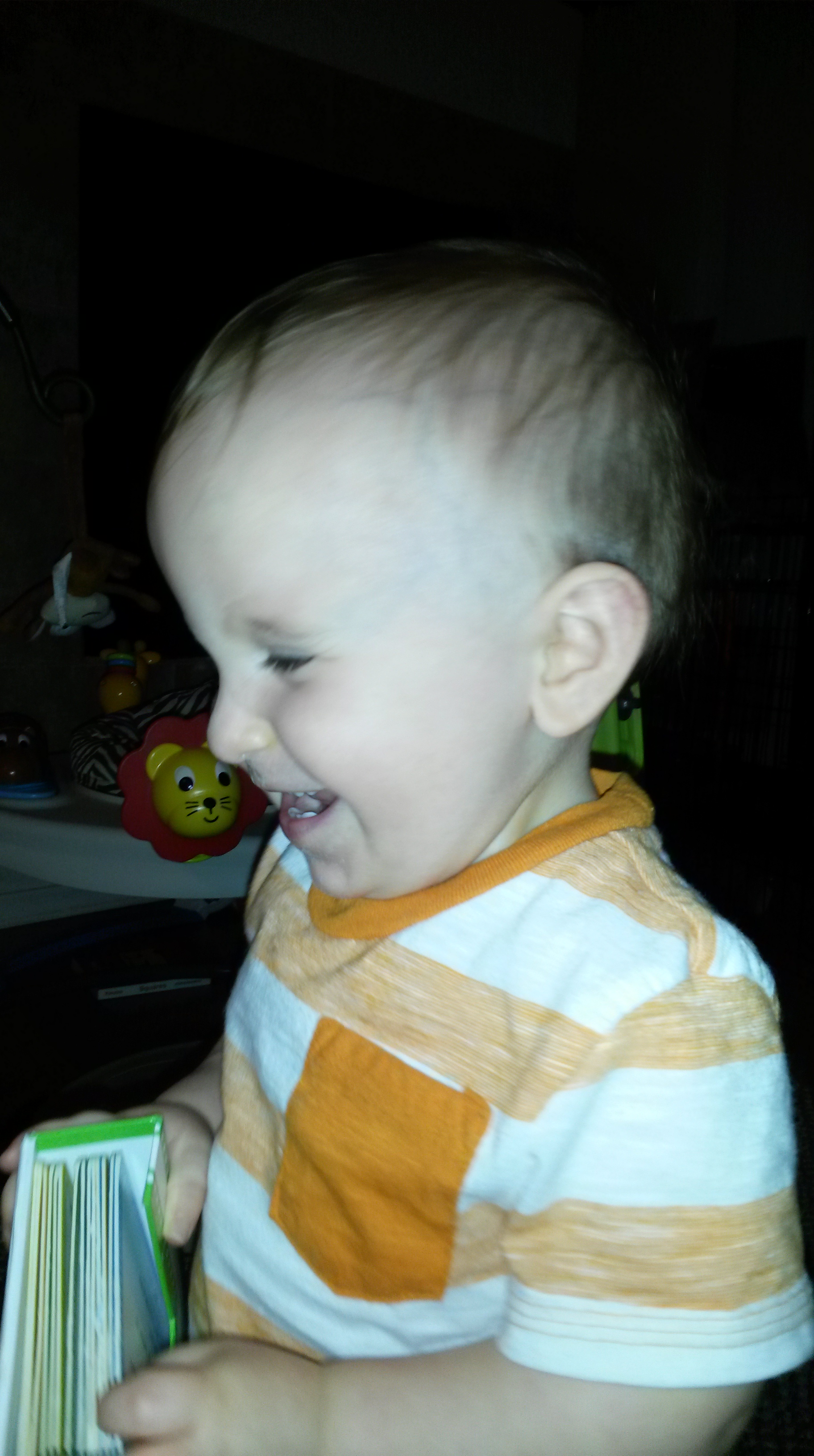 And in bigger news, we are really trying to say more words now! We “say” more please (but just the intonation, not the words), and we try to say “ball”, “bear”, “zebra” and “poo poo”. 🙂 We still prefer to say “uh-oh” for almost every occasion, however.
