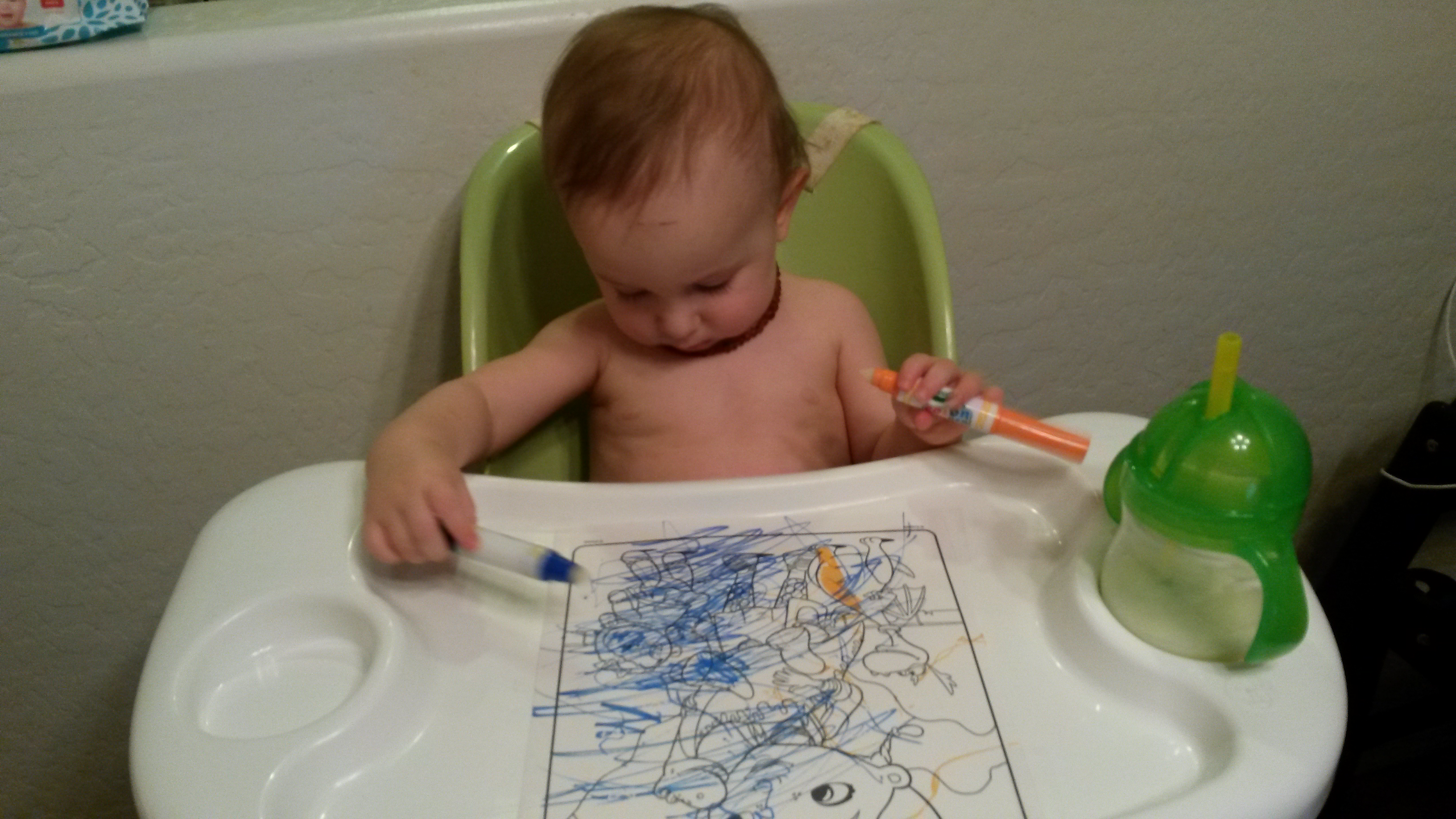 Coloring with markers (mommy is so so so excited about these magical markers that don’t draw on ANYTHING except this magical paper!)