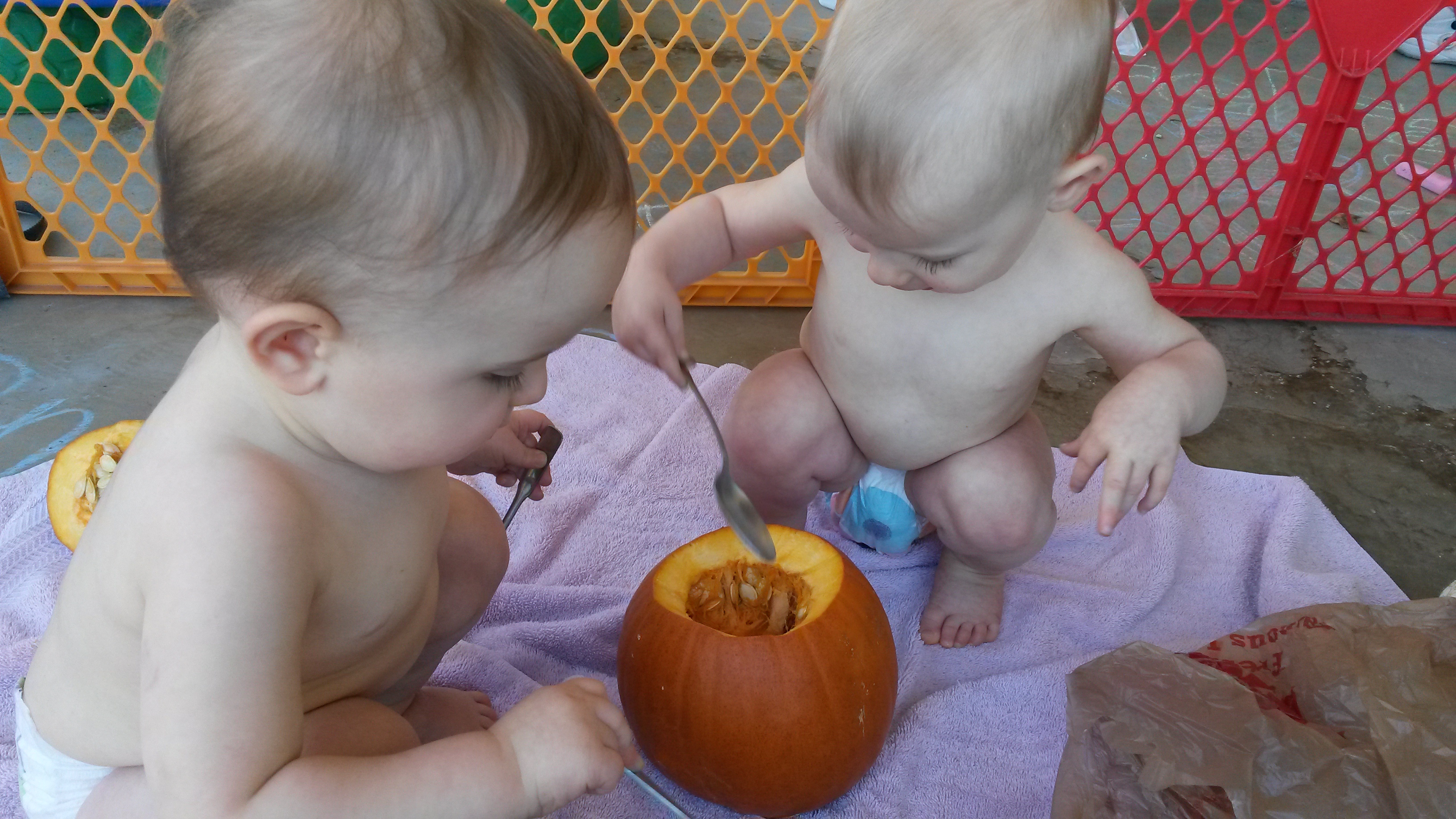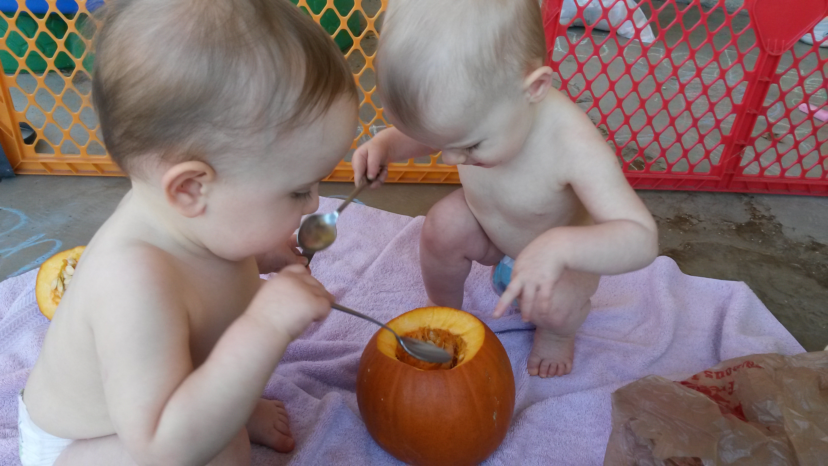 Here we are shopping for pumpkins!  And then we helped mommy gut our little pumpkin.  Aurelia wasn’t a fan of the slimy innards. (This pumpkin is what you get when mommy can’t find her pumpkin carving tools…)