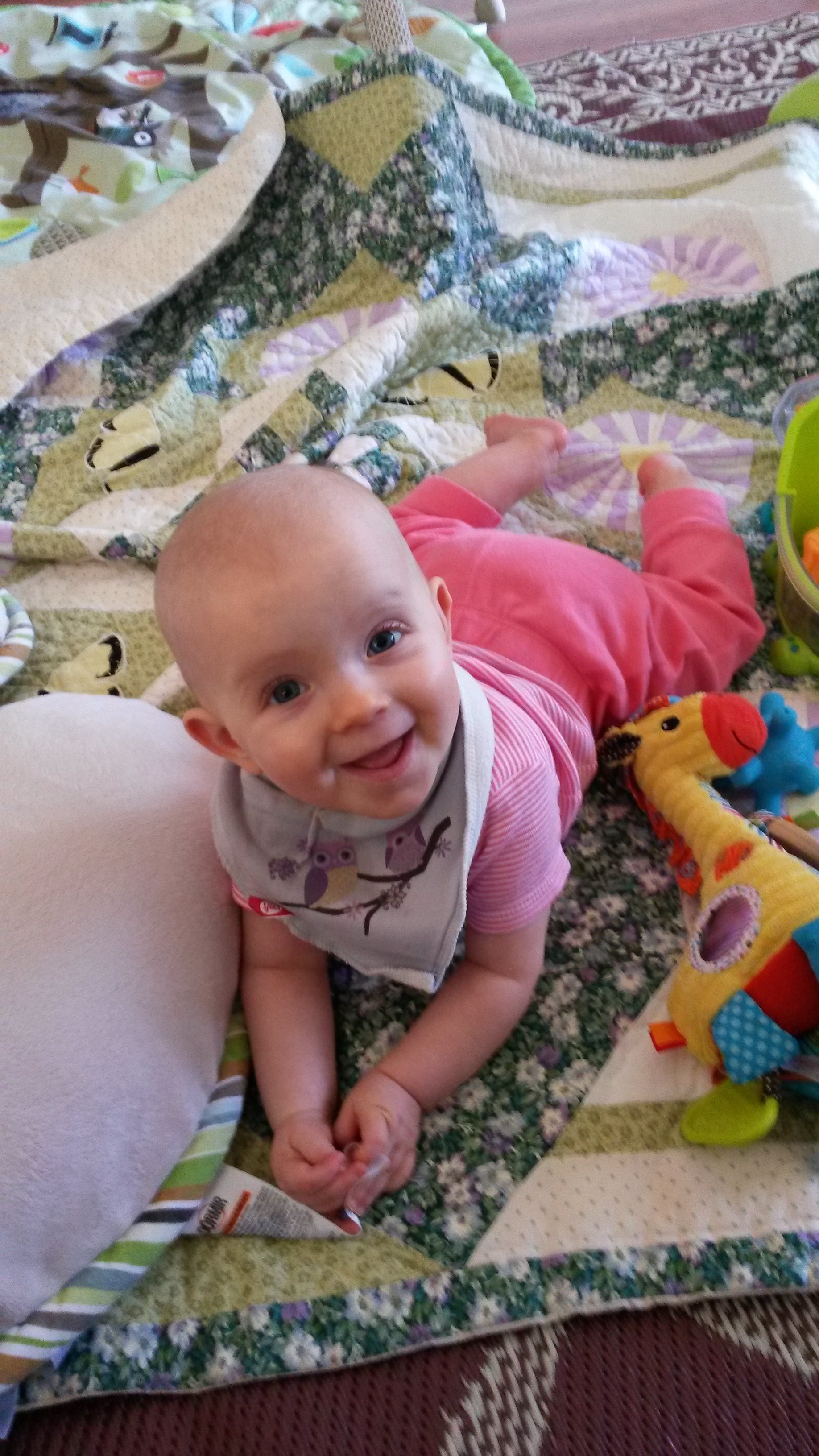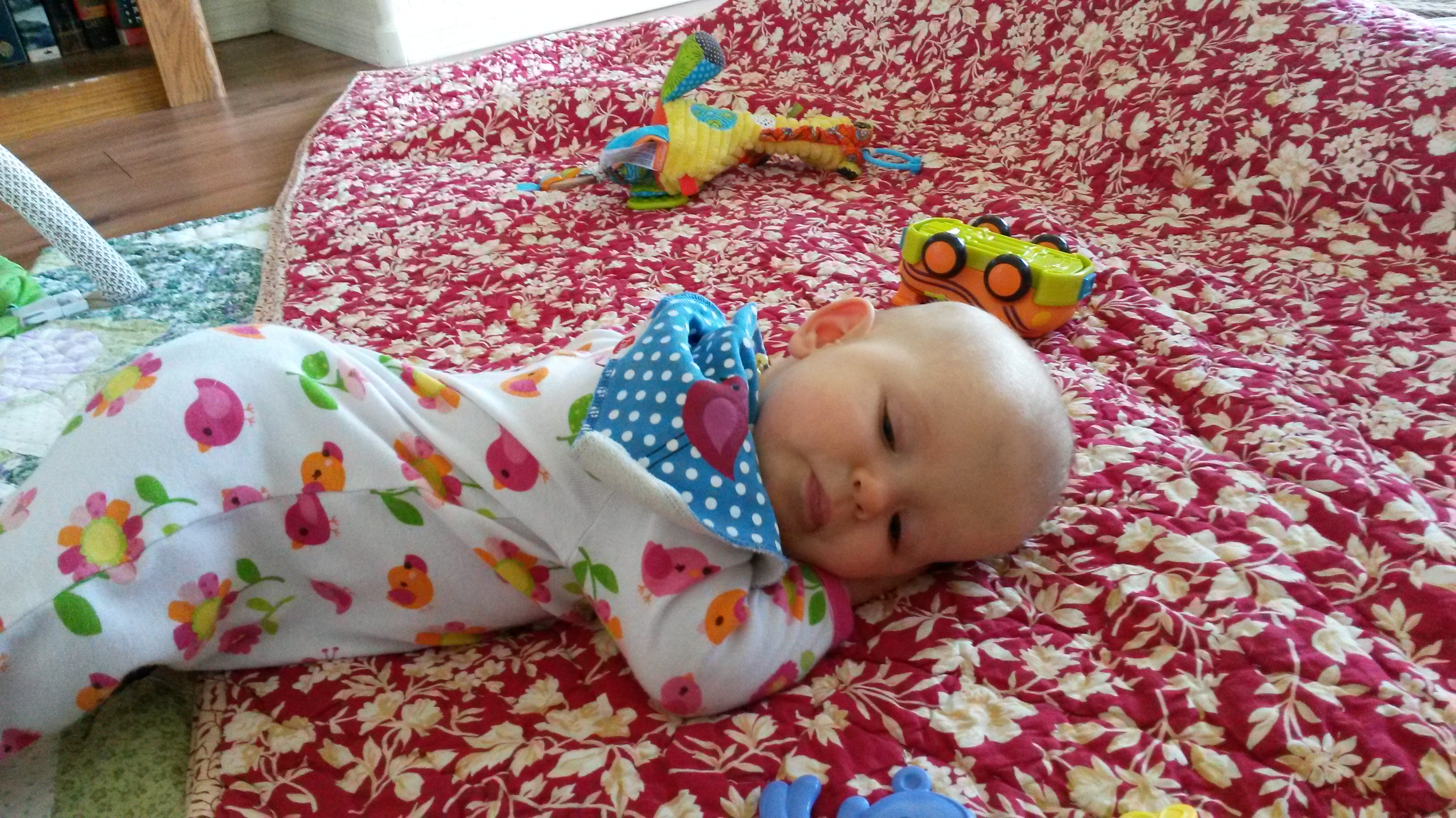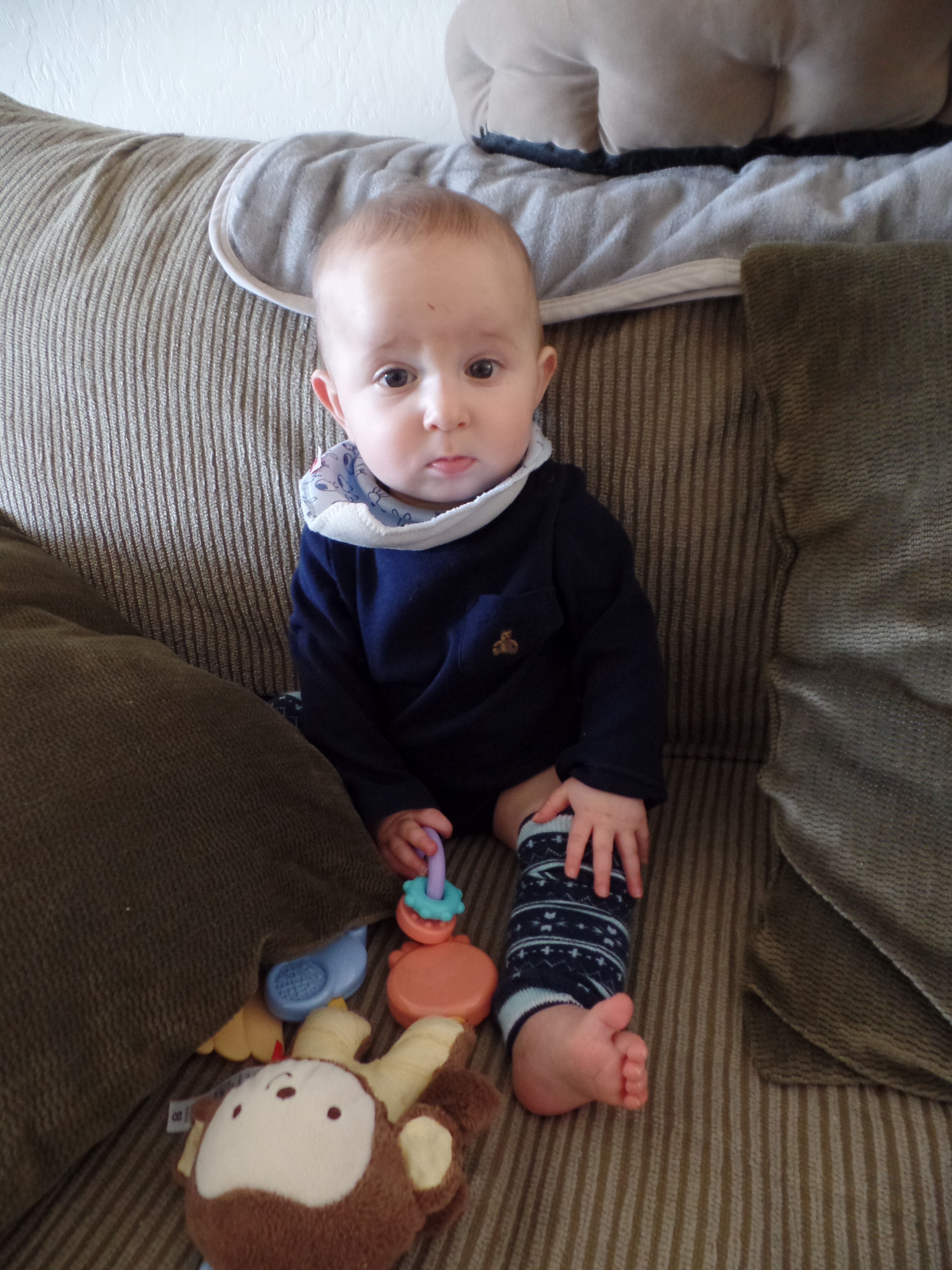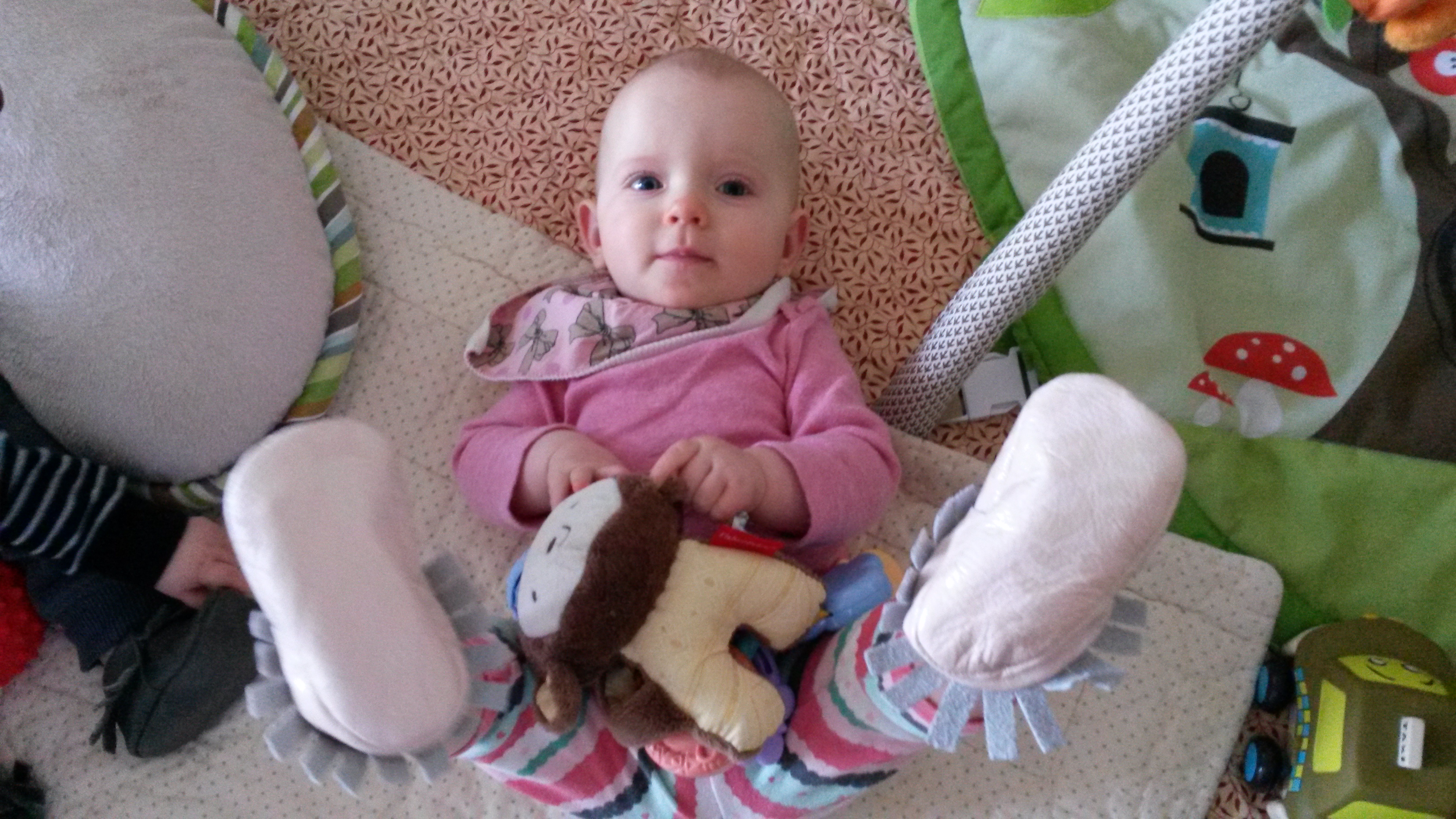 We are almost walking. We have taken a few cautious steps and are getting more confident. Aurelia now likes to get on her hands and knees and look around with her head upside down.
