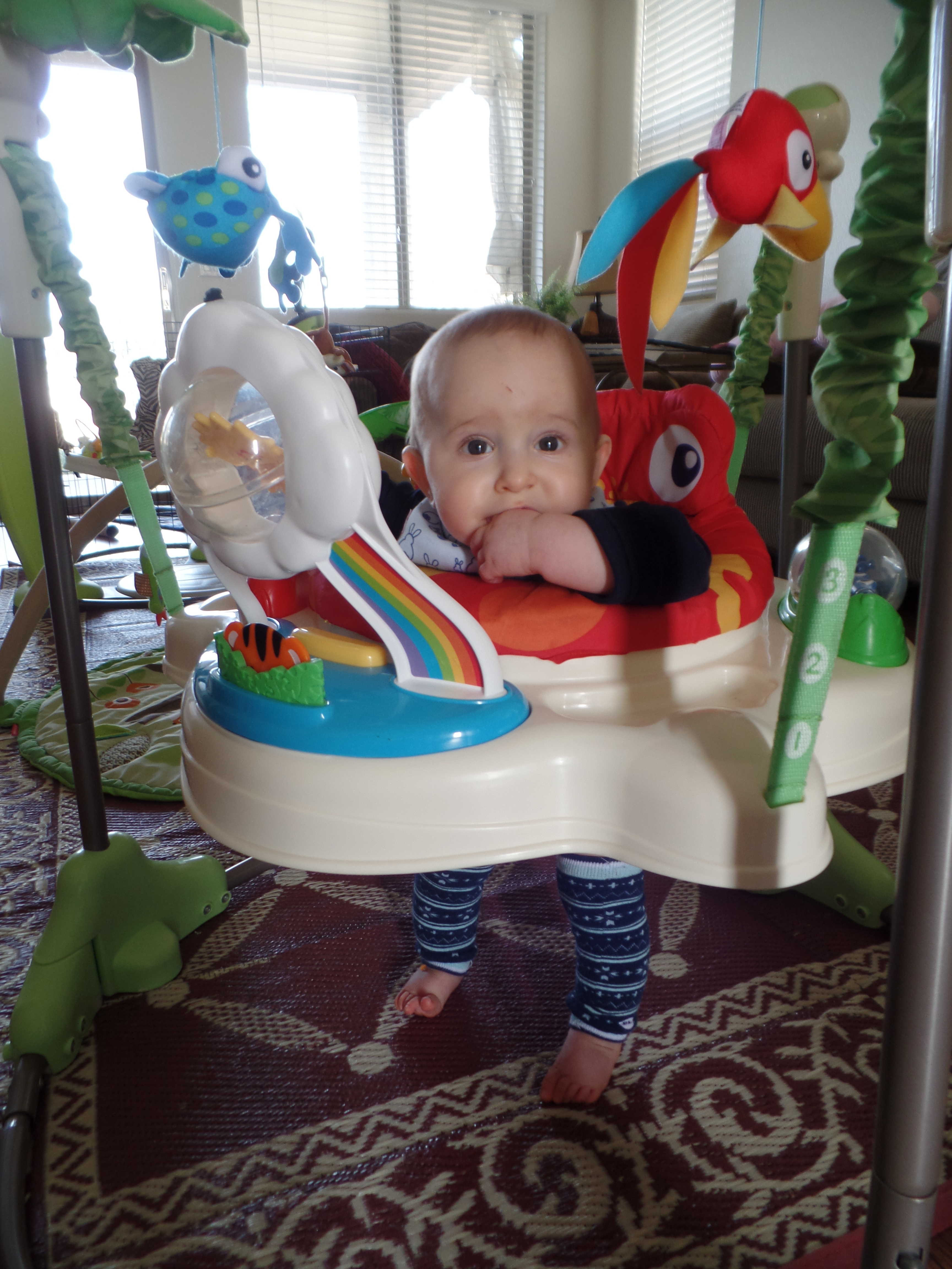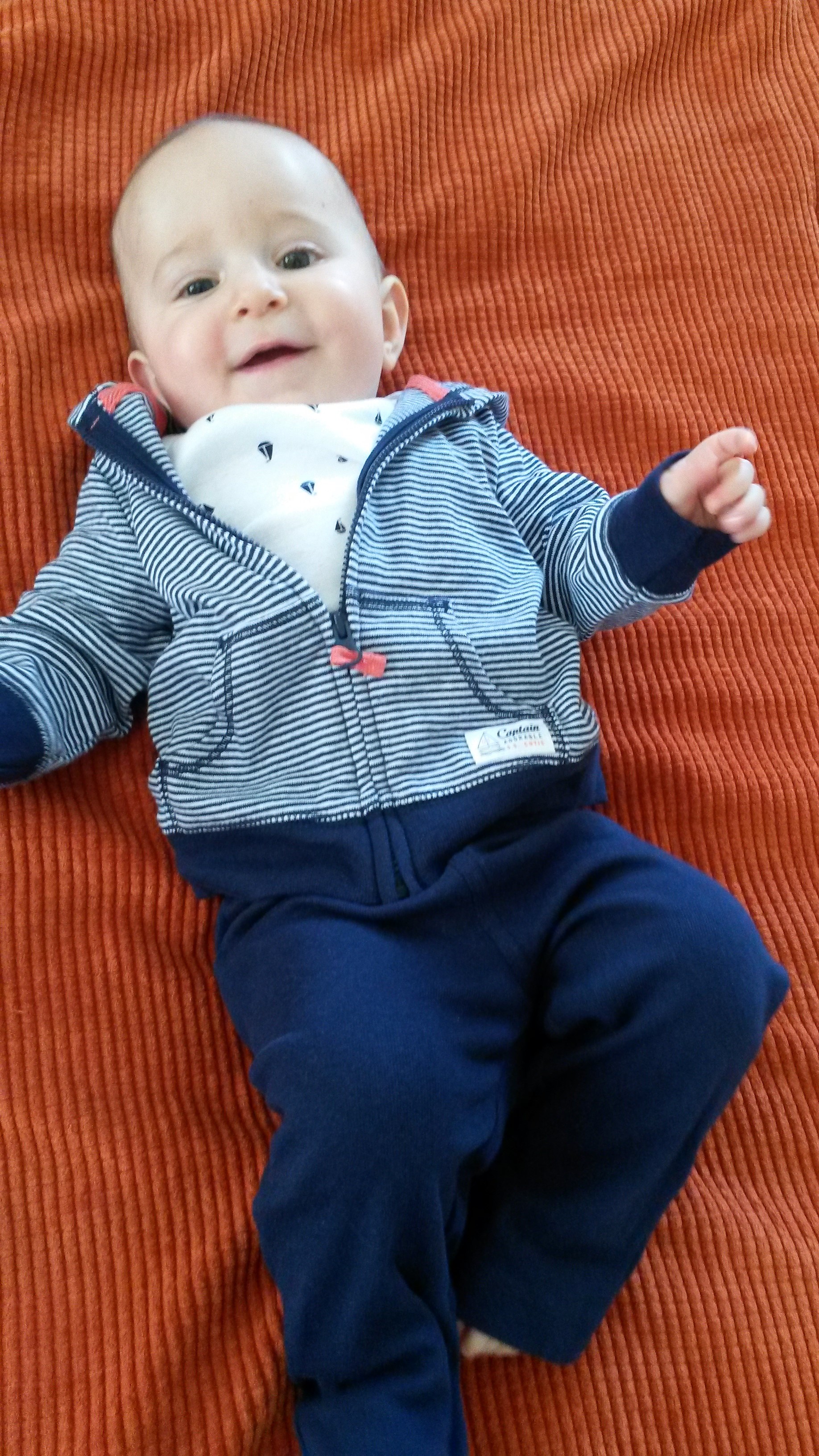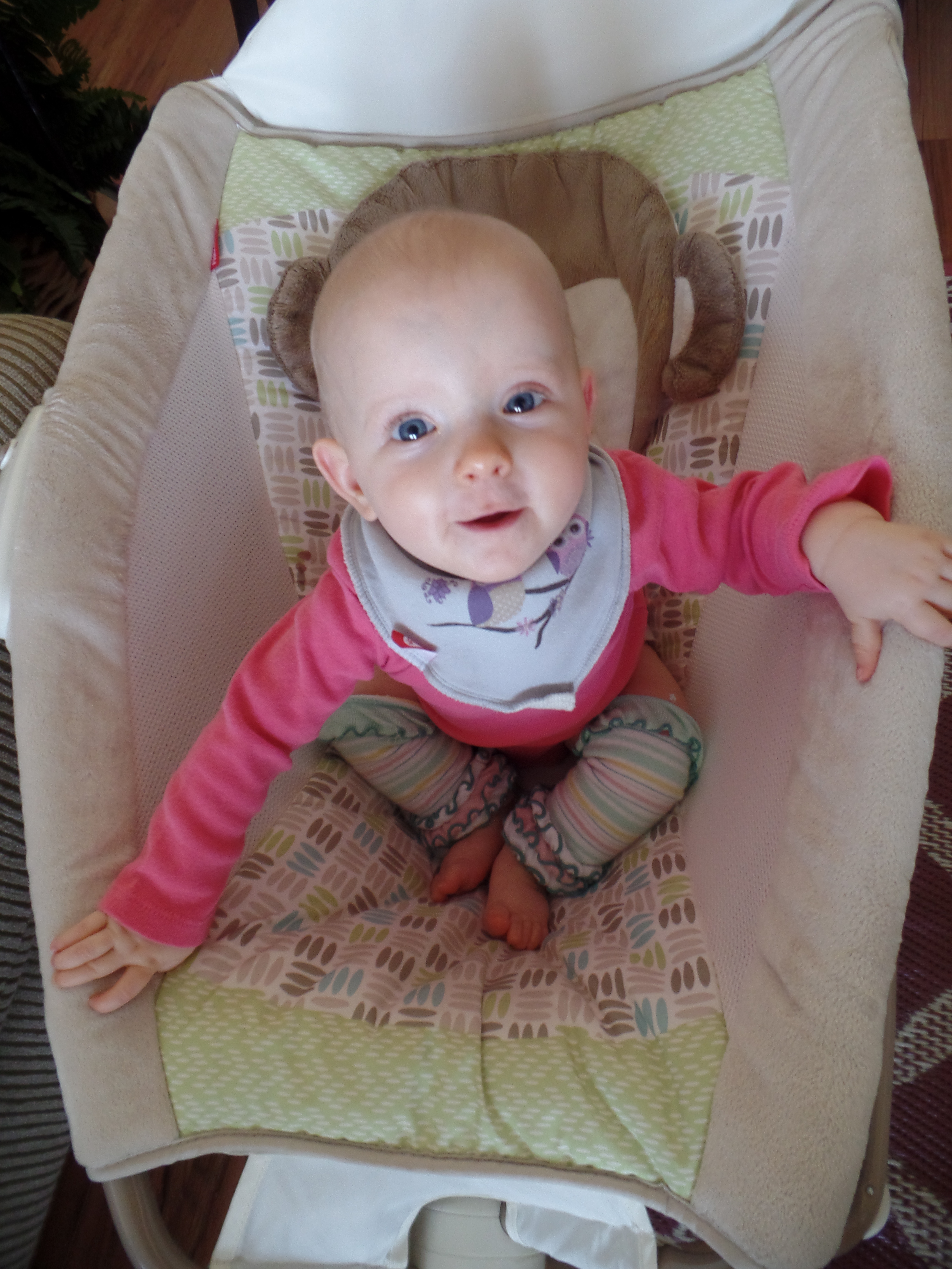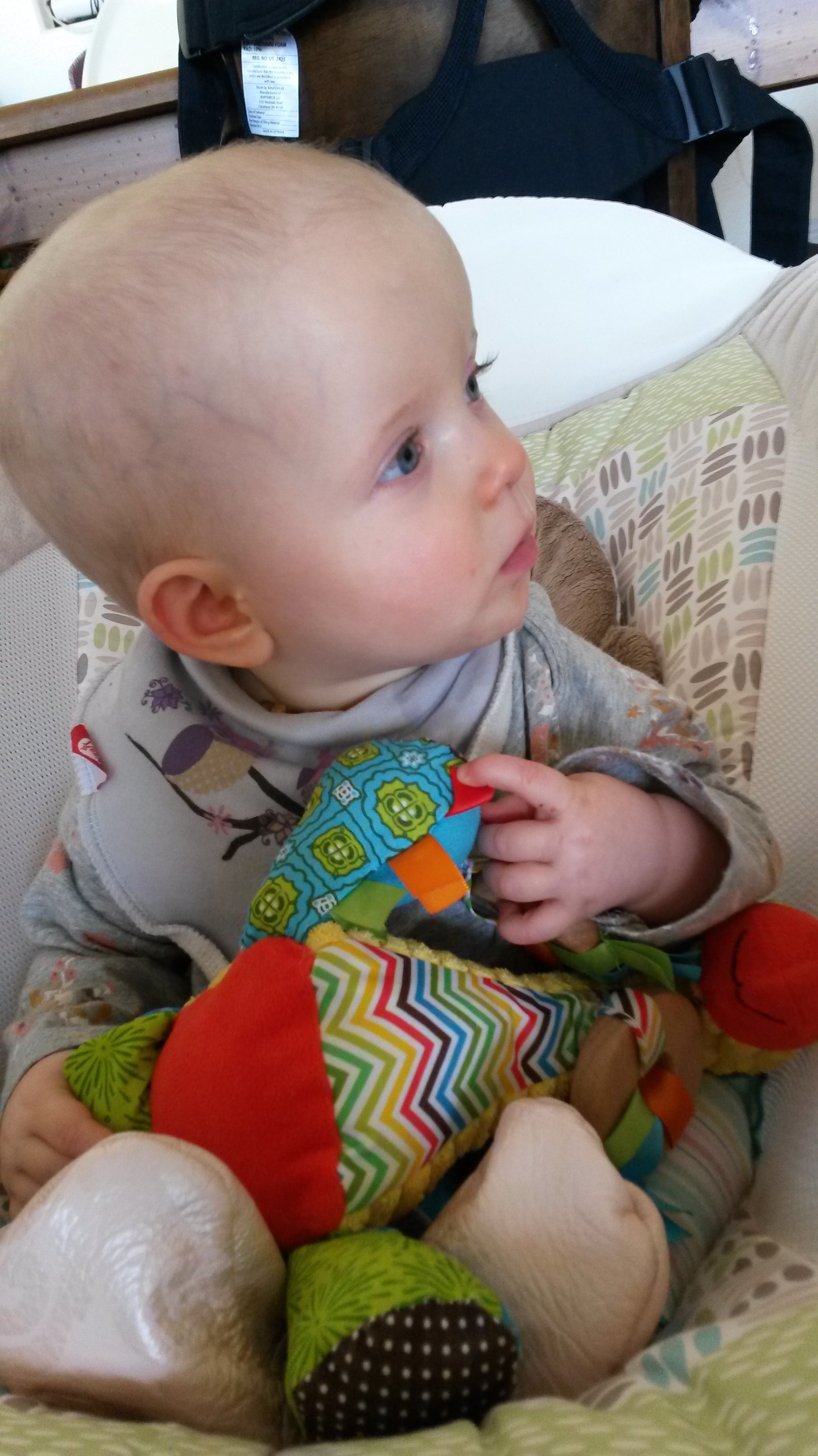 We are almost walking. We have taken a few cautious steps and are getting more confident. Aurelia now likes to get on her hands and knees and look around with her head upside down.